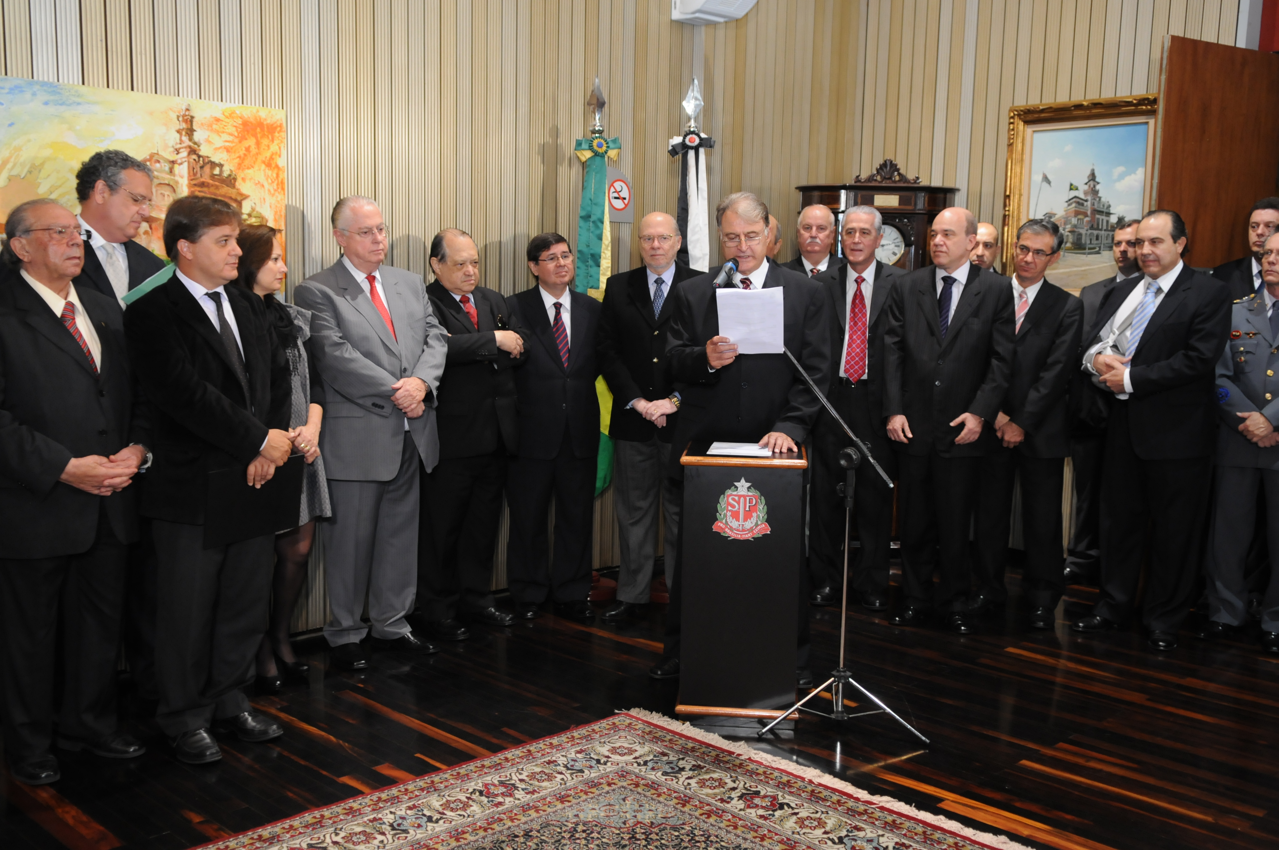 Presidente Barros Munhoz tomou posse no cargo de governador do Estado , na foto: Desemb Antônio Carlos Viana Santos, Luiz Antonio Marrey, Pres do TRE-SP Walter de Almeida Guilherme, Joao Barbosa, Ricardo Montoro, Presidente Barros Munhoz (assinando), Secr Justiça e Defesa da Cidadania, Ricardo Dias Leme, Conte Lopes, na posse: Carlinhos Almeida, Antonio Salim Curiati, Davi Zaia, Samuel Moreira , Procurador-geral de Justiça SP, Fernando Grella Vieira, Lourival Gomes, Luciano Santos Tavares de Almeida, José