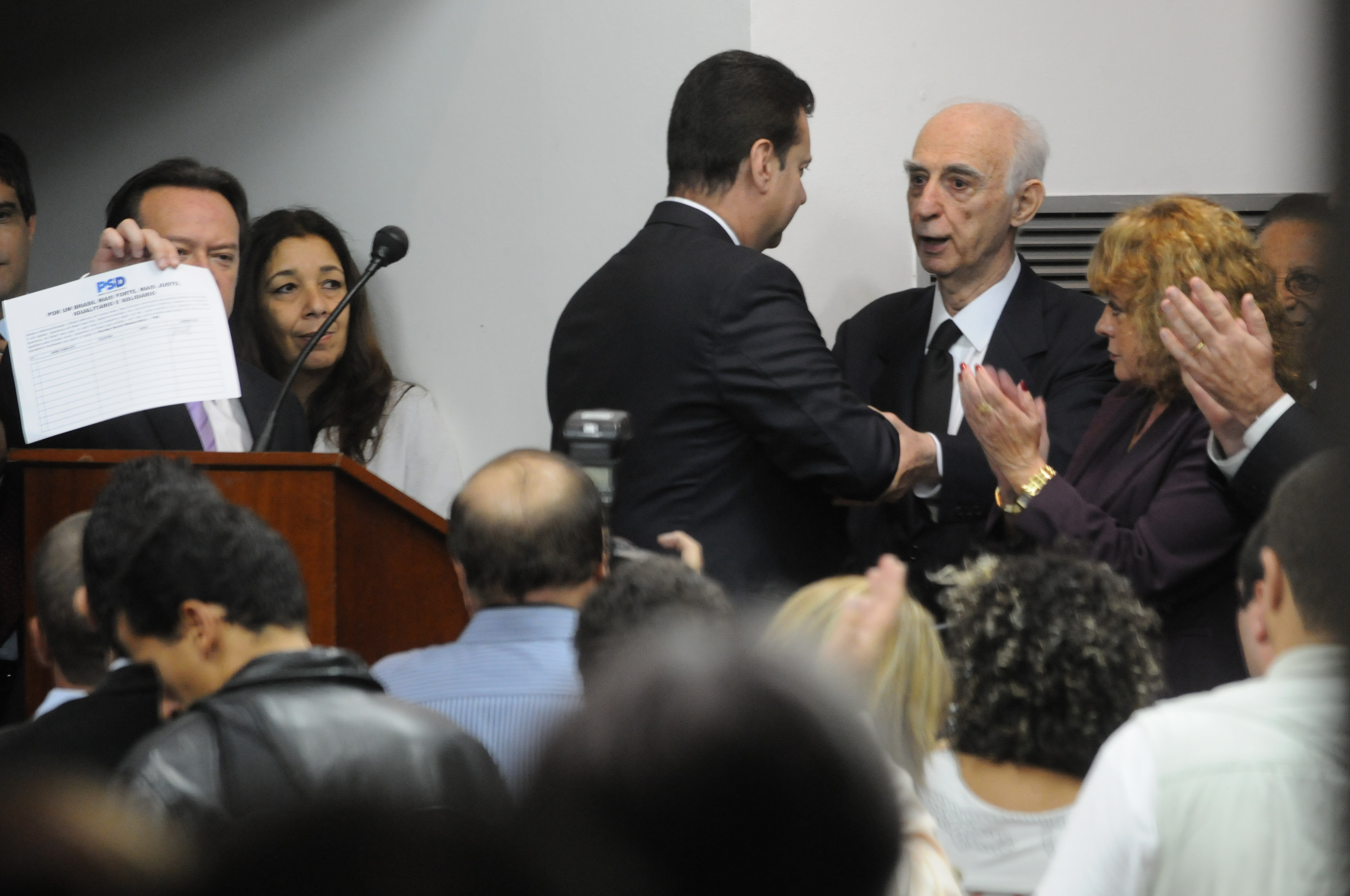 Prefeito de São Paulo anuncia criação de novo partido (PSD), na foto: Gilberto Kassab cumprimenta Claudio Lembo, 21/03/2011