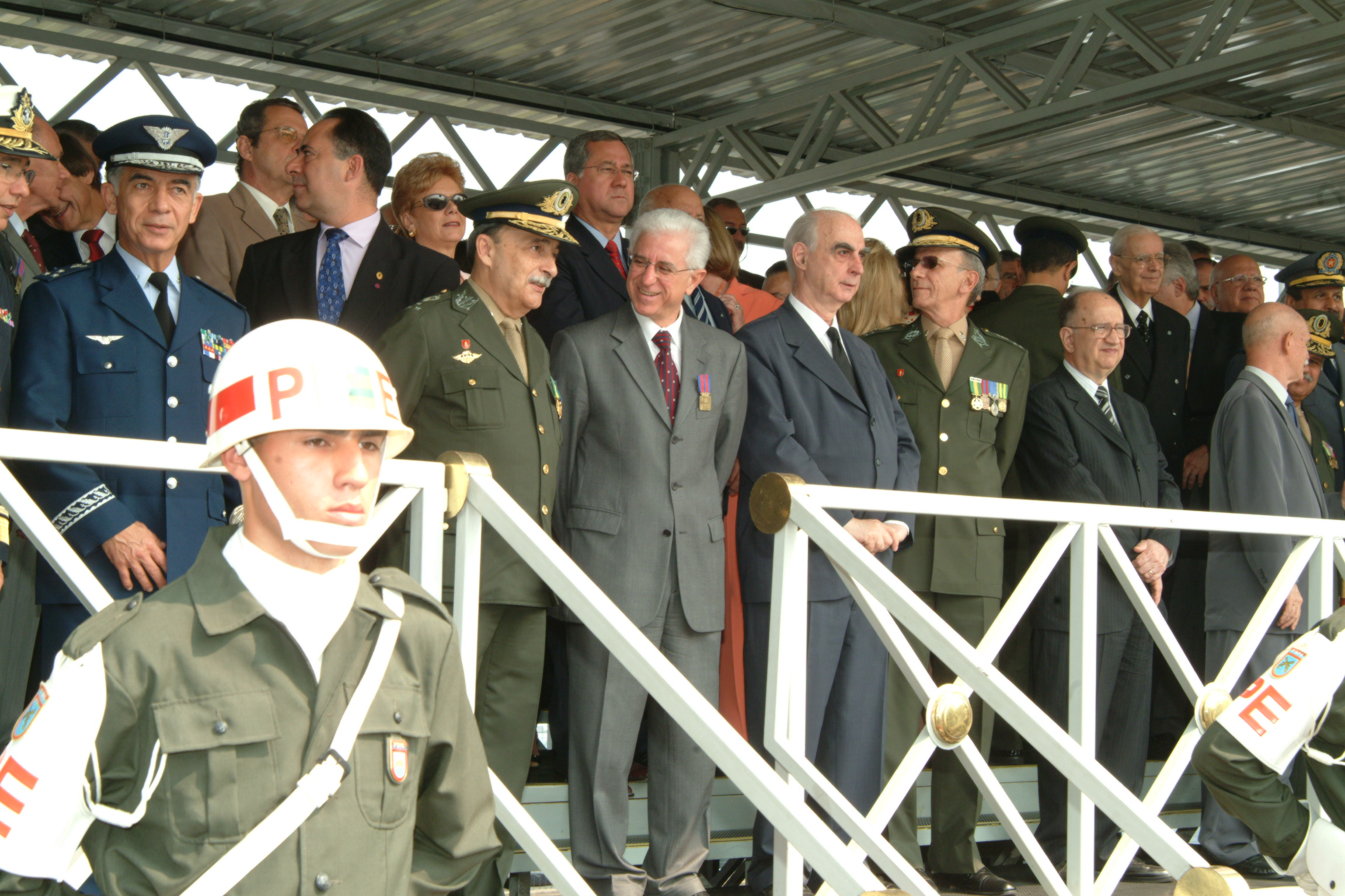 Solenidade em homenagem ao Patrono do Exercito - II Comando do Exercito, no palanque: Desembargador Armando Prado de Toledo, Militar, Presidente Sidney Beraldo, Claudio Lembo, Militar, Luiz Elias Tambara, 24/08/2004 Fotografia: Mauricio Garcia de Souza