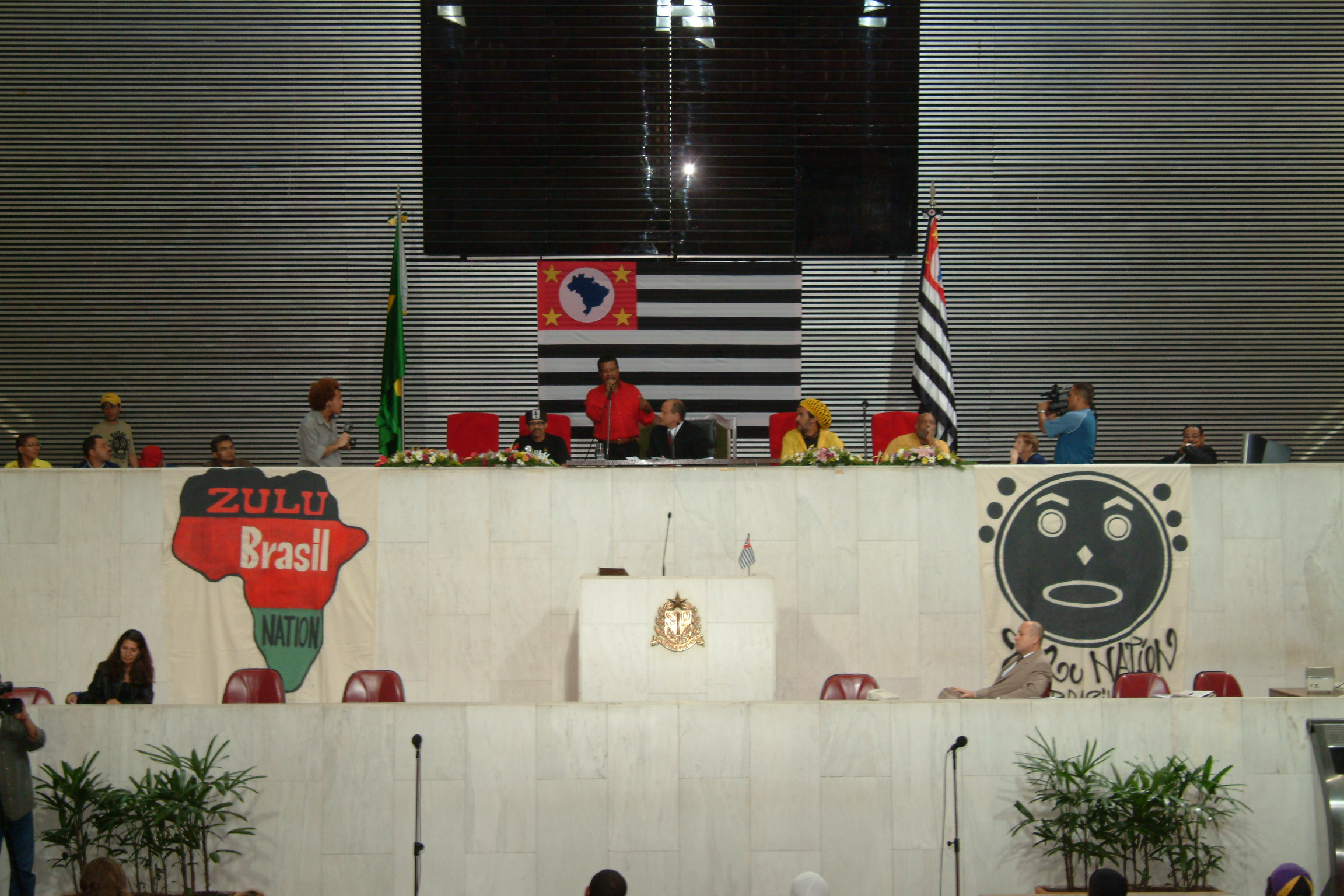 Sessao Solene em homenagem a OSCIP Zulu Nation Brazil. No Plenário JK, na foto ao centro: Mario Reali, Nelson Triunfo (toca amarela), na solene: Wilson Roberto Levi, Osvaldo Faustino, Joaquim de Oliveira Ferreira, 12/11/2004