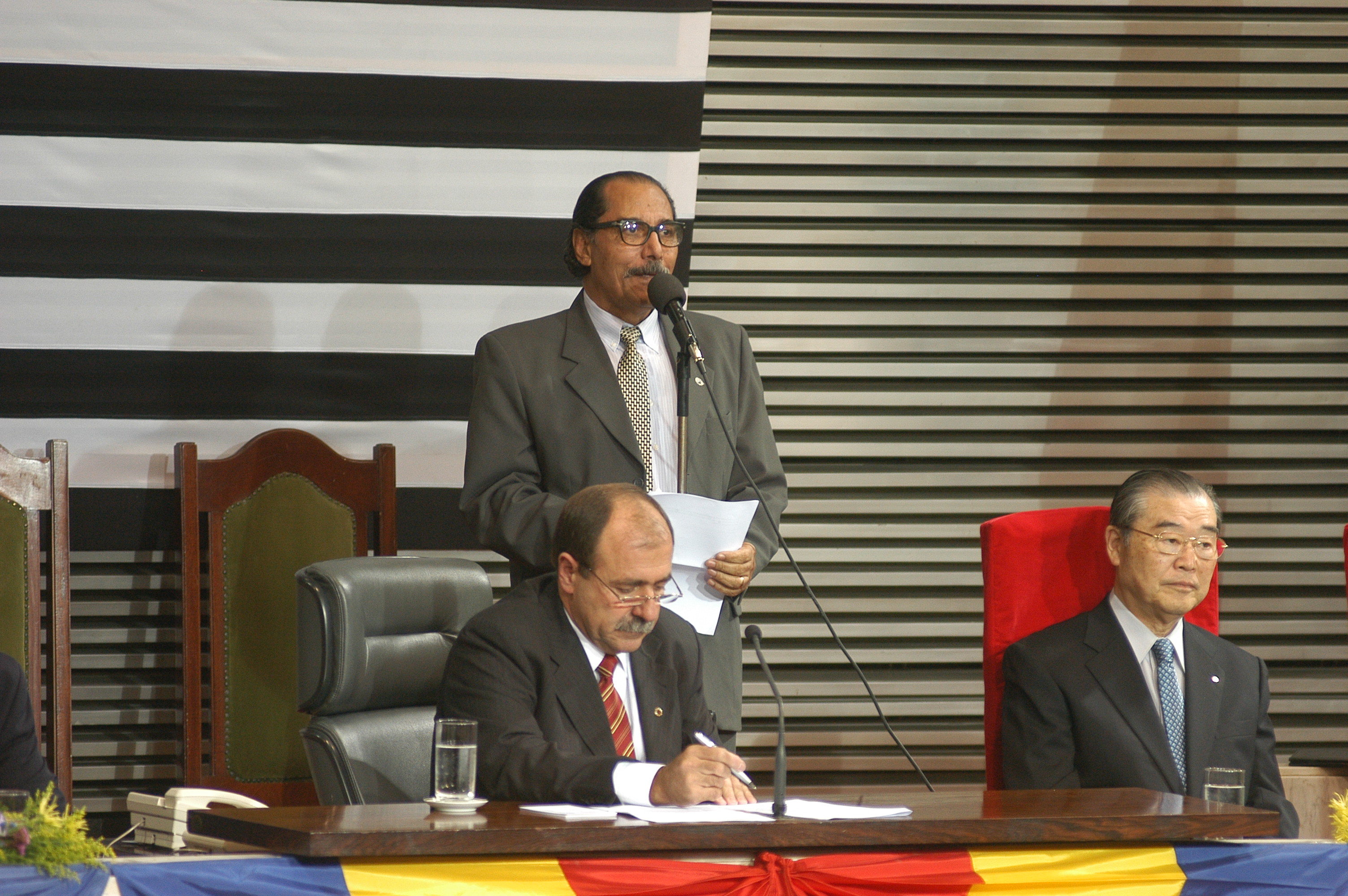 Solene Soka Gakai, na foto: Joao Caramez, Getulio Nakajima, Mohamed Habib (em pe), na solene: Arnaldo Faria de Sa, Carlinhos Almeida, 22/11/2004