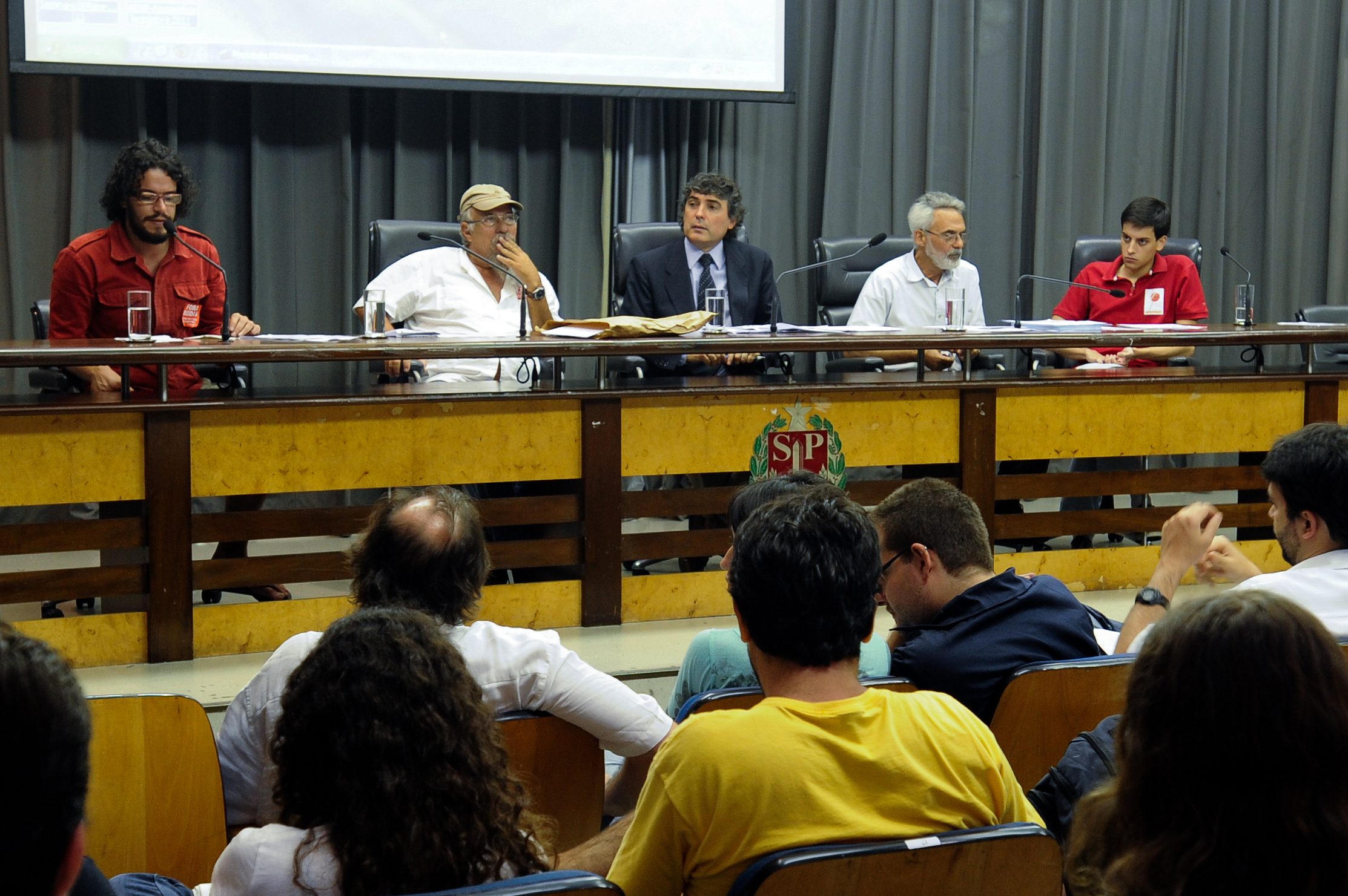 Estudantes da Universidade de Sao Paulo apresentam reivindicaçoes em debate, na foto: Rafael Alles, Magno de Carvalho, Carlos Giannazi, Cesar Augusto Minto, Thiago Aguia, 28/11/2011