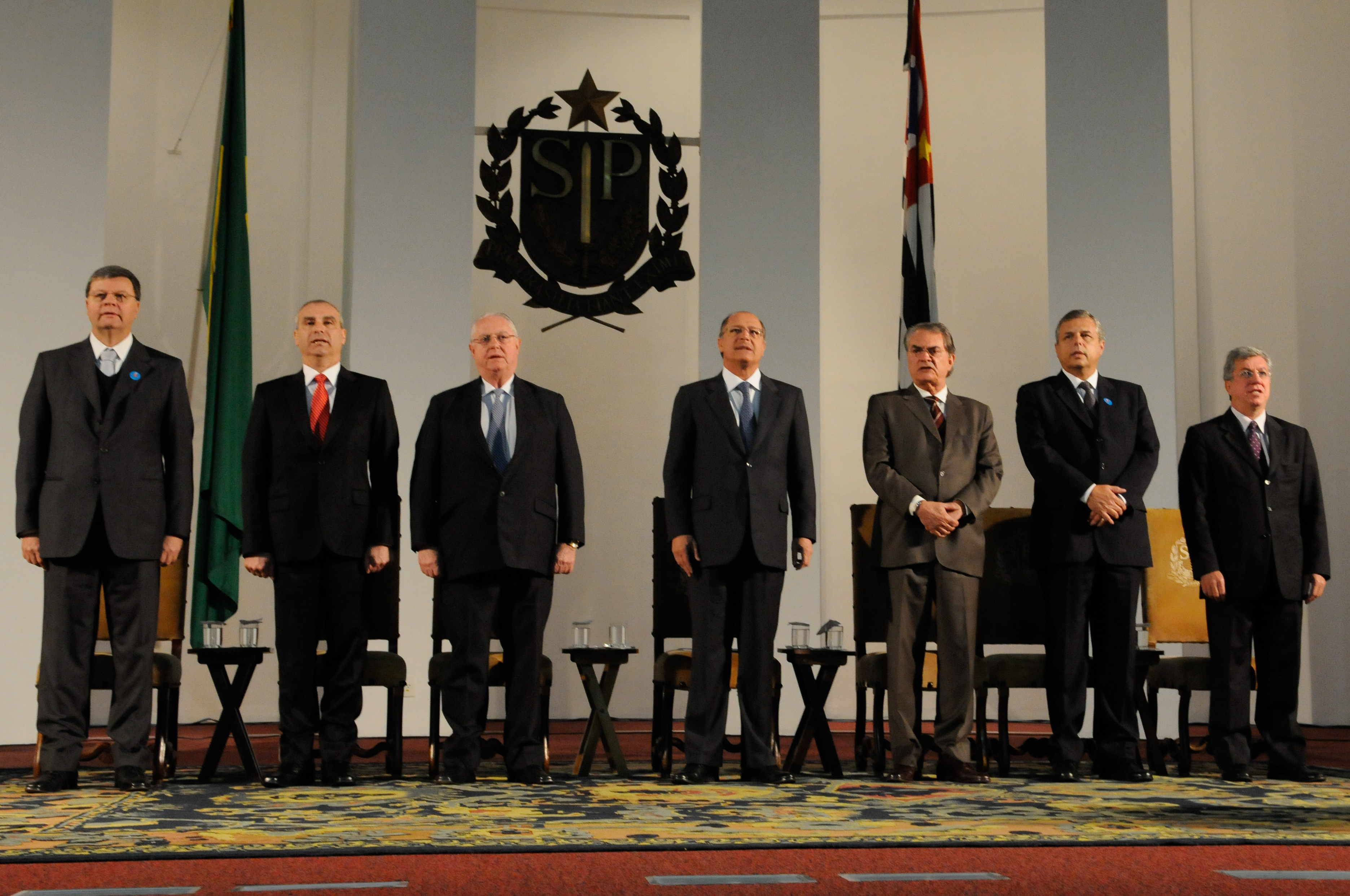 Novos delegados tomam posse na Polícia Civil . Carreira foi reconhecida como jurídica a partir da promulgacao da PEC 35, aprovada pela Assembleia , na foto: Paulo Afonso Bicudo, Marcos Carneiro Lima, Presidente Barros Munhoz, Gerlado Alckmin, Antonio Ferreira Pinto, Valdir Sebastiao Junior, Edson Ortega, 08/08/2012