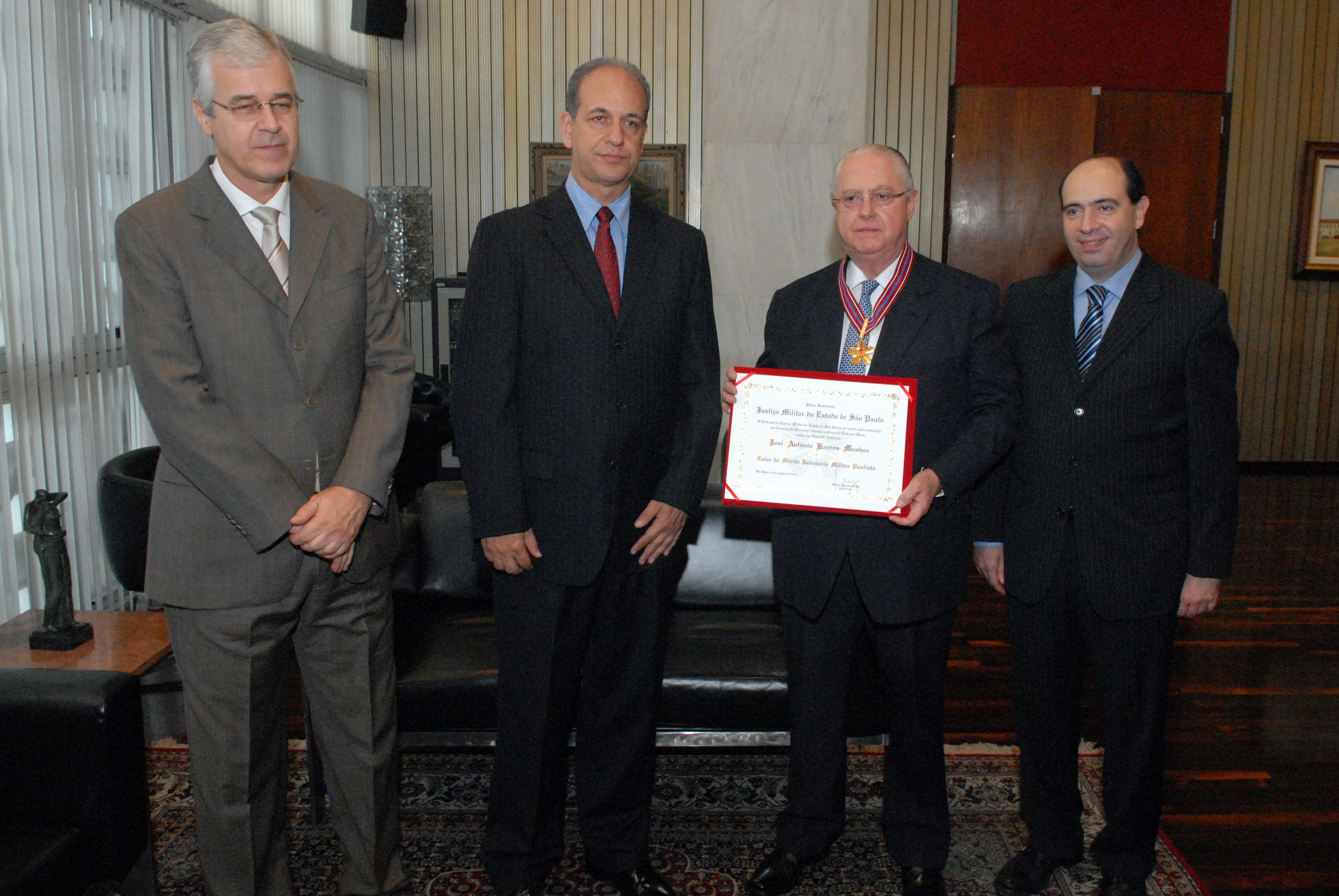 Outorga do Colar do Merito Judiciário Militar Paulista ao presidente da Assembleia Legislativa, deputado Barros Munhoz, na foto: Fernando Pereira, Orlando Eduardo Geraldi, Presidente Barros Munhoz, Paulo Adib Casseb, 12/11/2012 Fotografia: Roberto Navarro