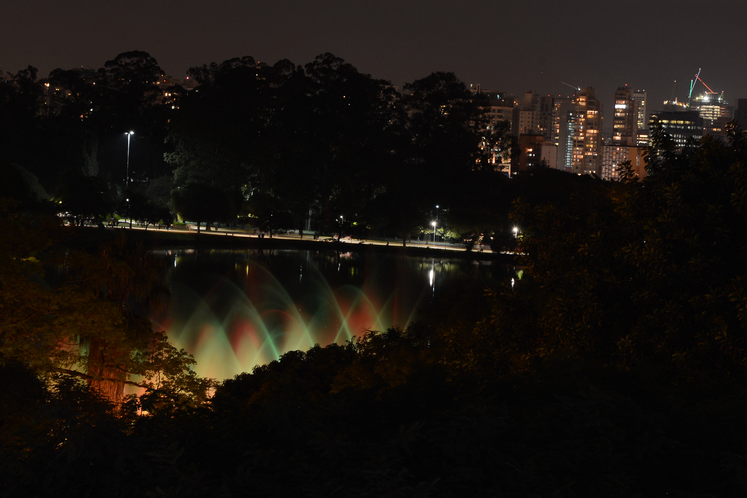 "Balé das Águas", fonte do Ibirapuera.Ao fundo guindastes iluminados próximos a Juscelino