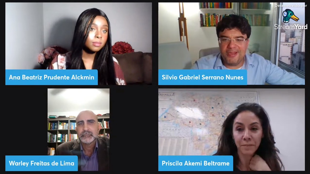 Palestrantes Ana Beatriz Prudente e Warley organizador Silvio Serrano e mediadora Priscila Beltrame em seminário sobre a Declaração dos Direitos Humanos.