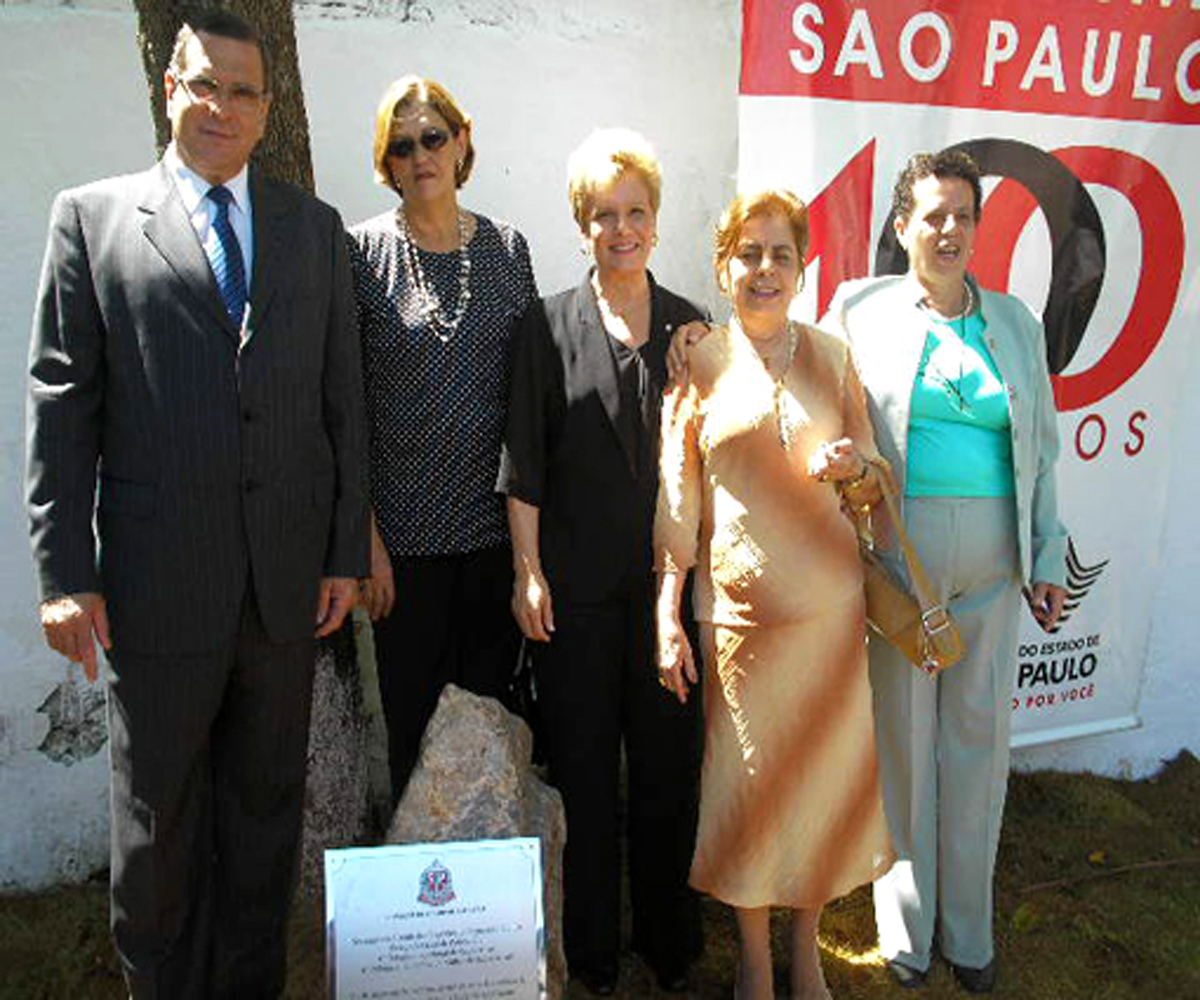 Deputada Rosmary Corrêa (ao centro) participa do lançamento da pedra fundamental da sede da 6ª Delegacia de Defesa da Mulher, em Santo Amaro