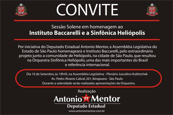 Convite do evento que homenageará o Instituto Baccarelli e Sinfônica Heliópolis